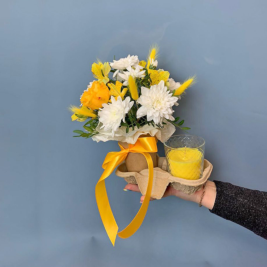 Такой небольшой букет подойдёт, чтобы порадовать коллегу, сделать сюрприз подруге или преподнести в знак благодарности. Он легко впишется в рабочий кабинет, создаст уют на письменном столе или в гостиной. А запах от аромасвечи наполнит комнату приятным ароматом.