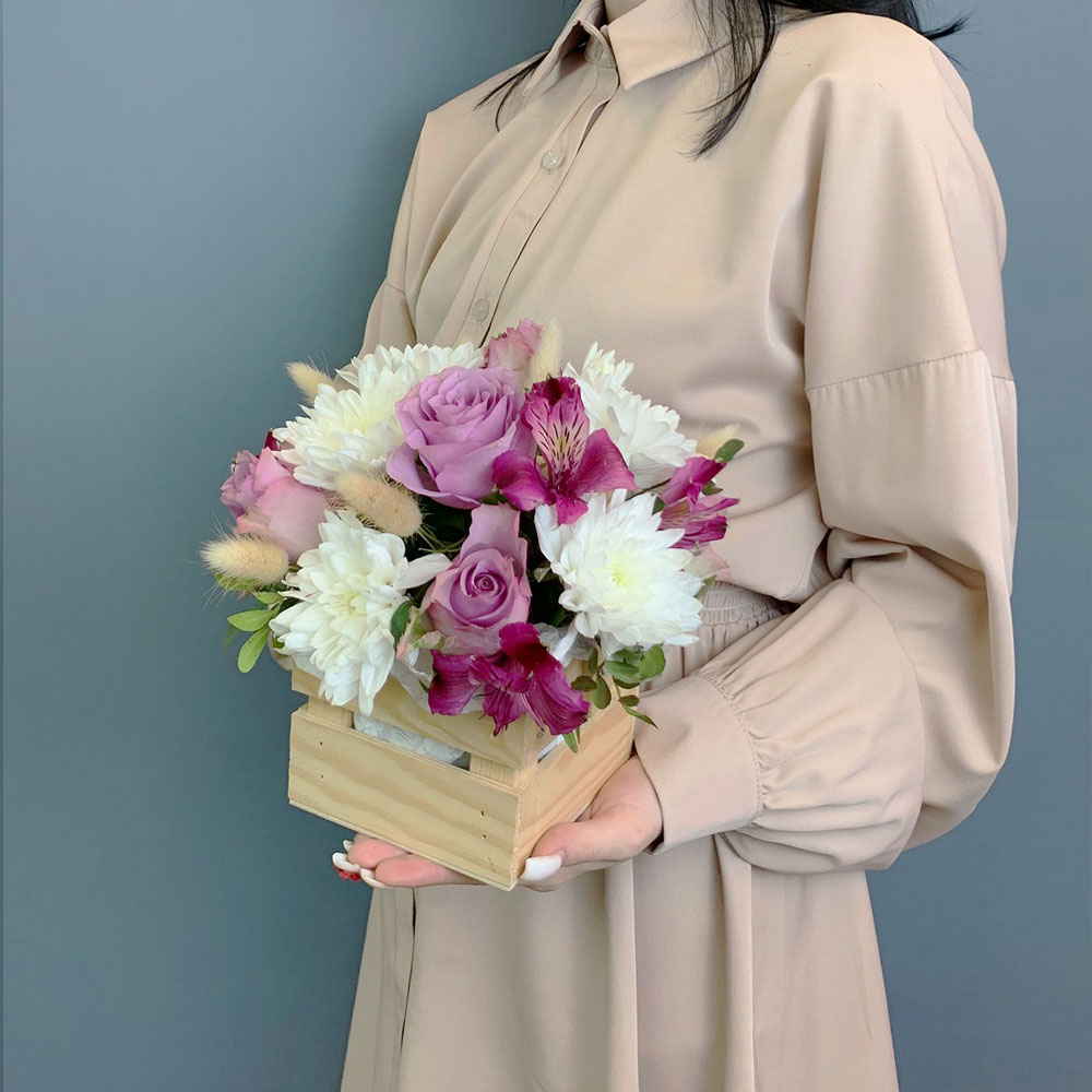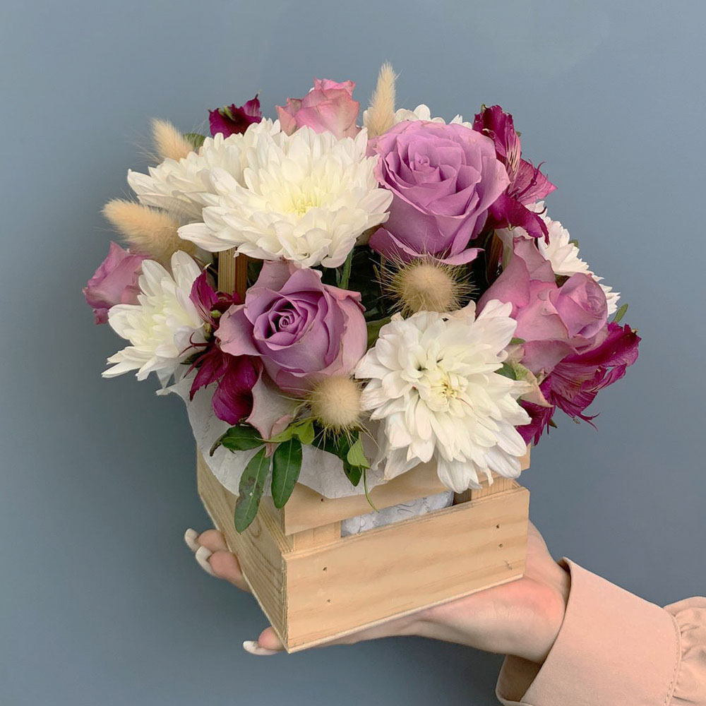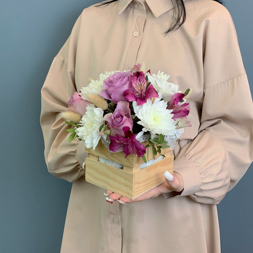 Чтобы букет радовал дольше, достаточно слегка увлажнять губку, сохраняя цветы свежими. Хризантемы и альстромерии славятся стойкостью, поэтому композиция будет сохранять красоту несколько дней. Закажите цветы в ящике с быстрой доставкой и порадуйте тех, кто для вас дорог.