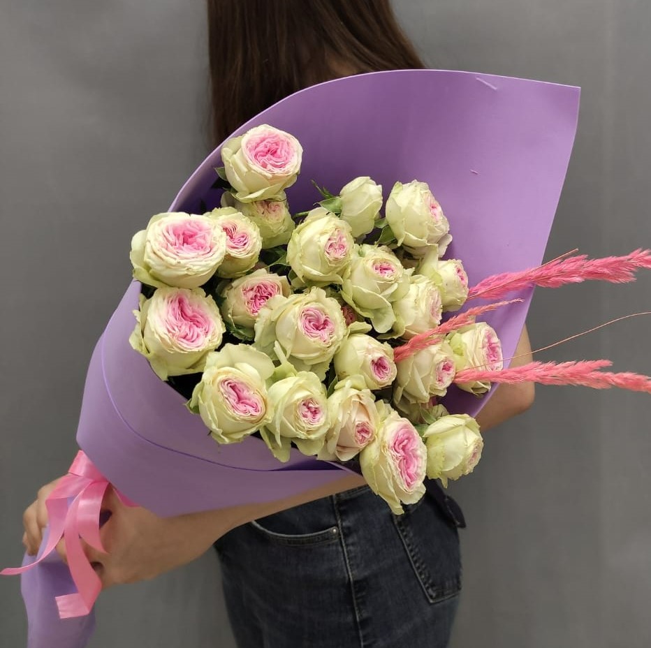 Букет из кустовых пионовидных роз бело-розового цвета арт. 47529