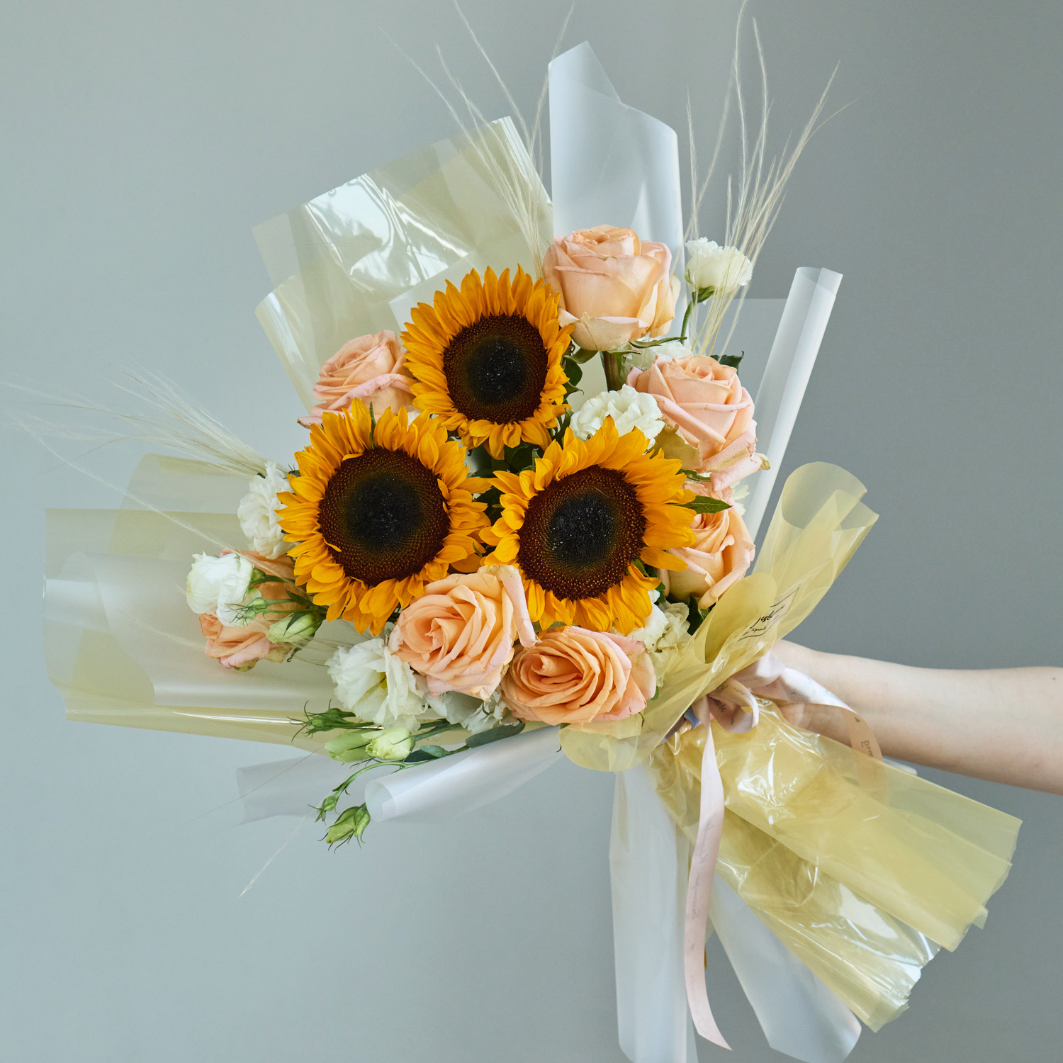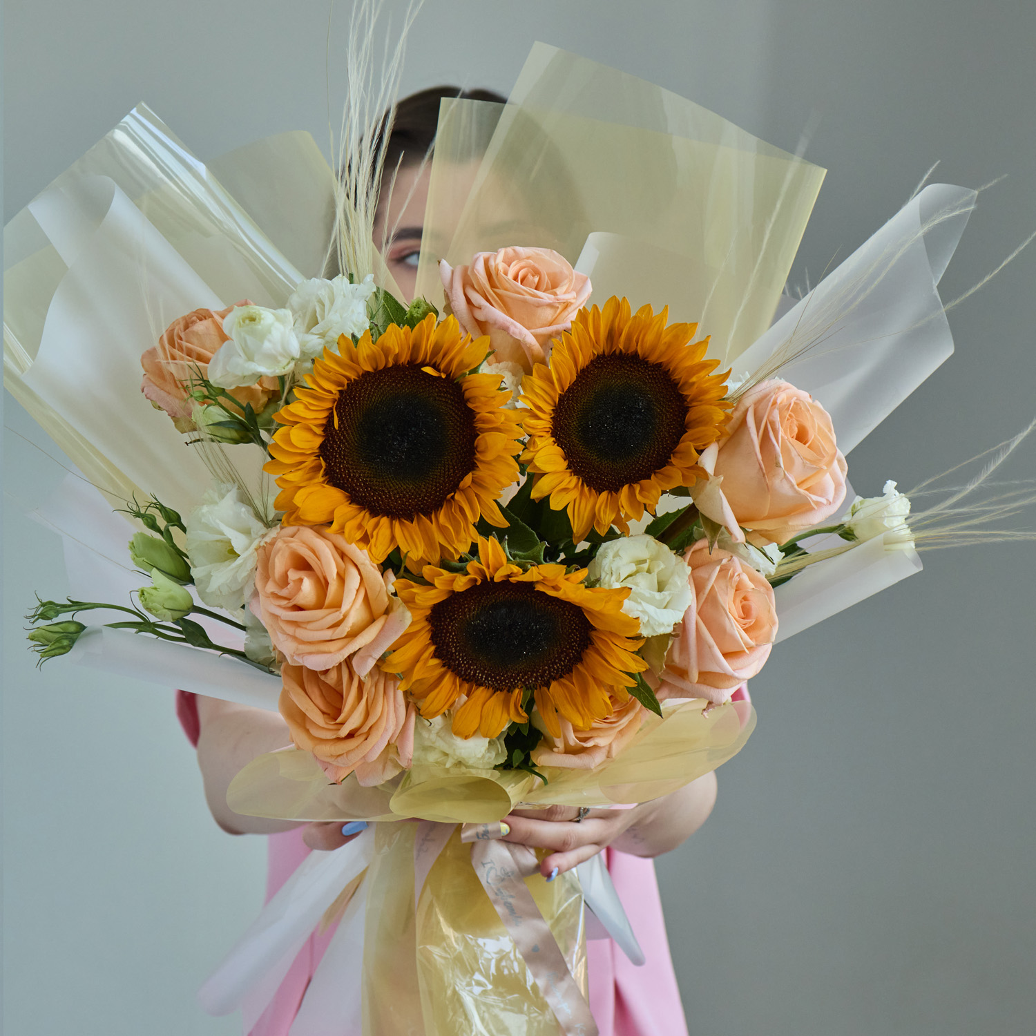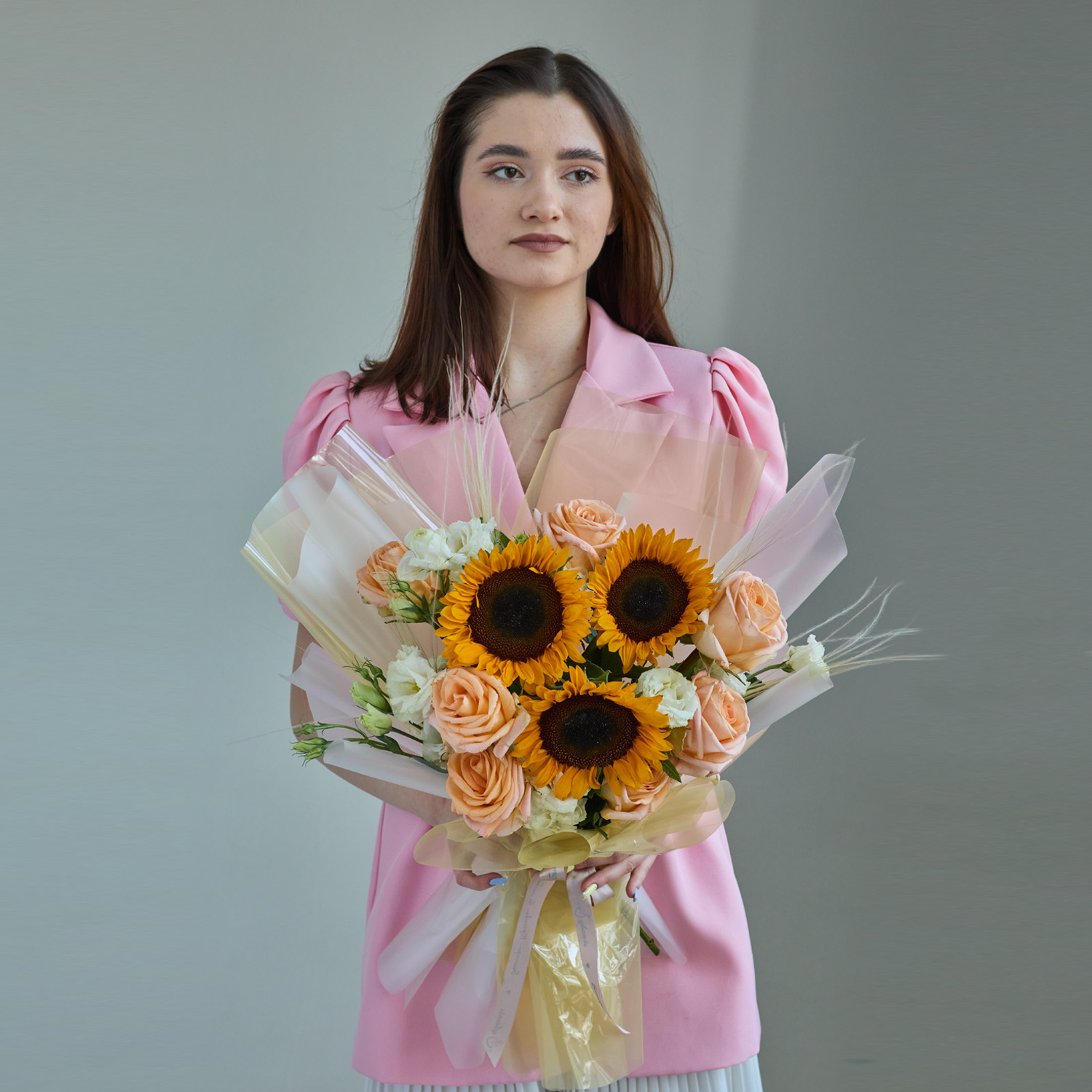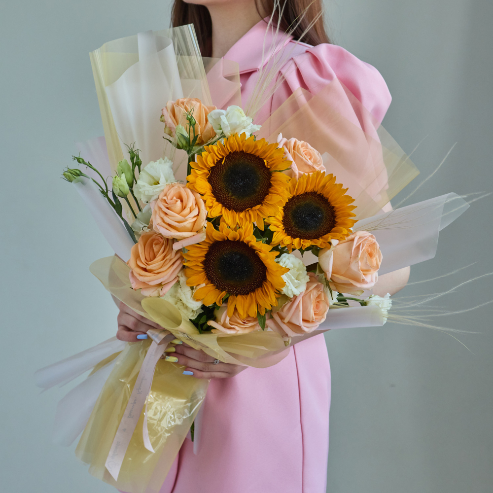 Букет "Гармония" из кустовой хризантемы, розы эквадор, гиперикума и диантуса(гвоздика). арт. 22465
