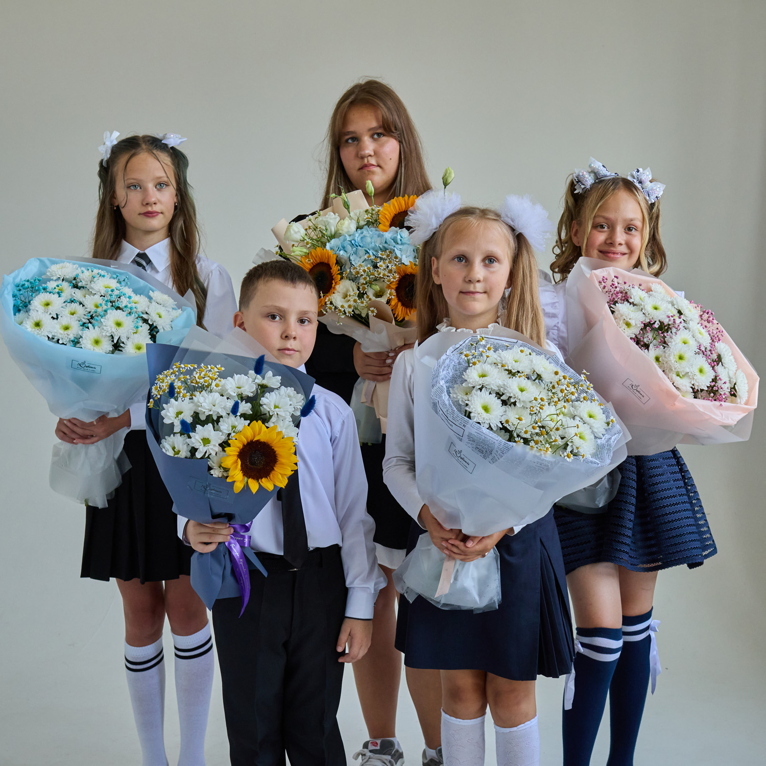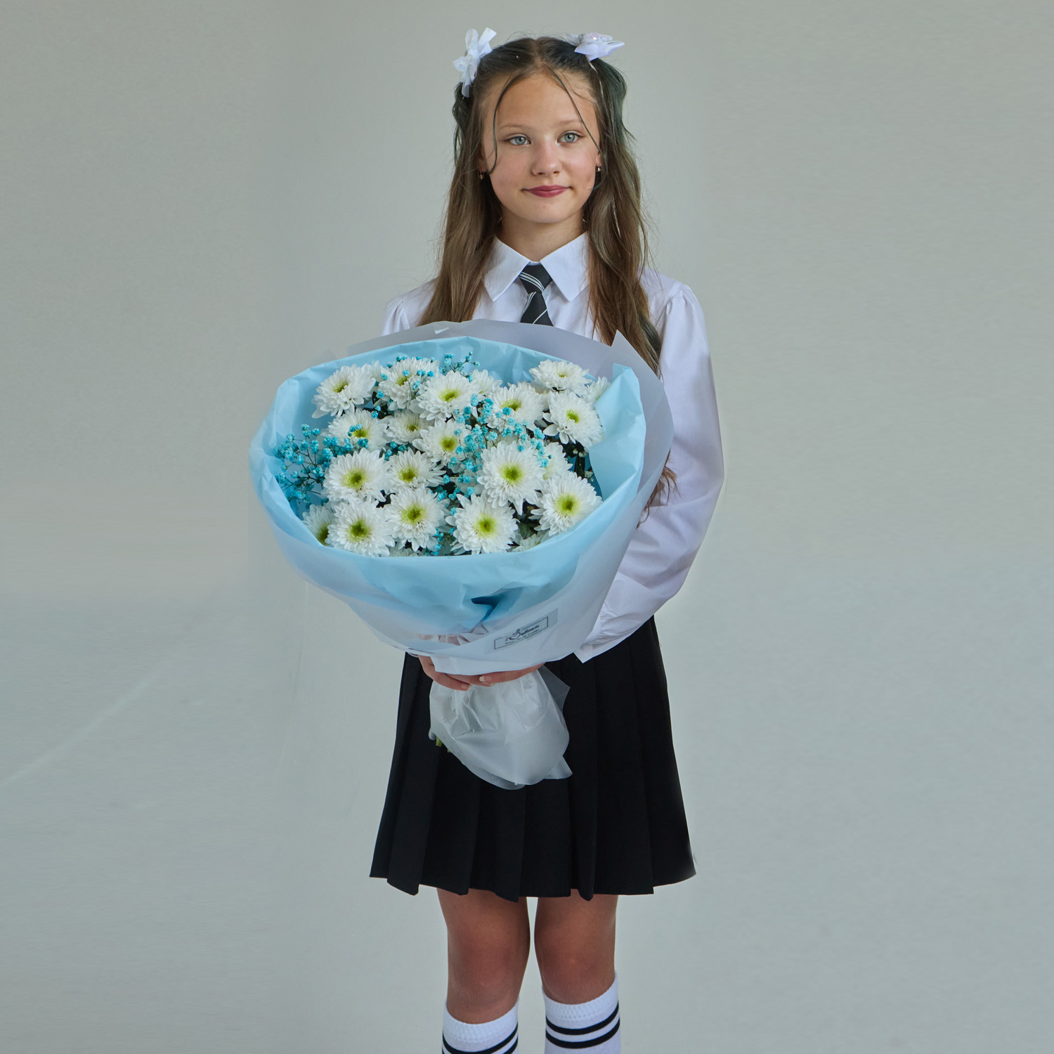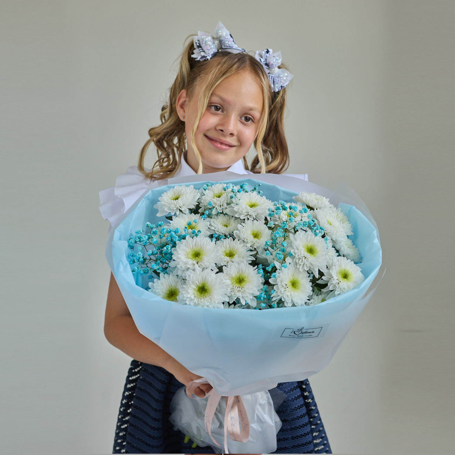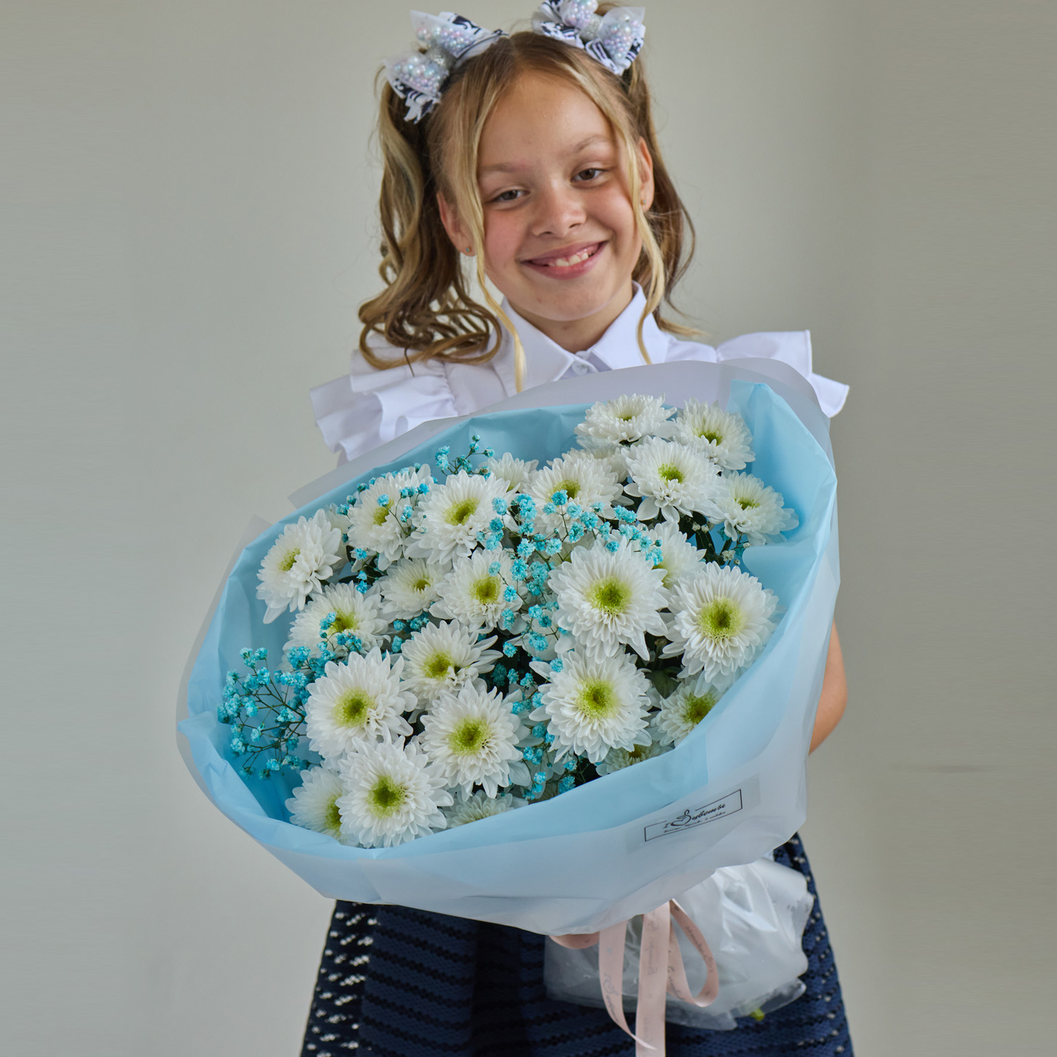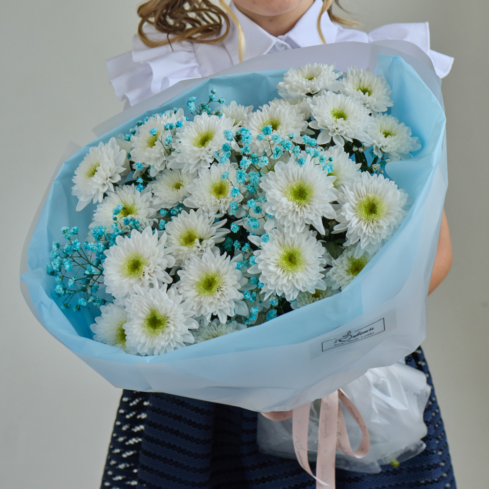 Он прекрасно подойдёт как подарок учителю на 1 сентября, станет уместным сюрпризом для мамы или знаком внимания дорогому человеку. Голубая гипсофила добавляет композиции оригинальности, поэтому букет можно подарить как на школьное событие, так и на день рождения или в знак искренней благодарности. Такой вариант смотрится стильно и современно, подчёркивая внимание к деталям.