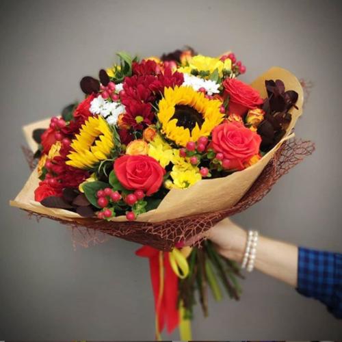 Букет "Буйство красок" из кустовой хризантемы, розы Эквадор, гиперикума и подсолнуха арт. 5531